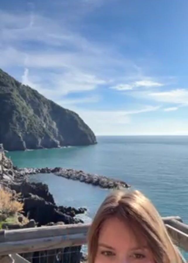 A fair-skinned woman with long blonde hair stands smiling on a wooden deck or balcony, overlooking a rocky coastline and the sea