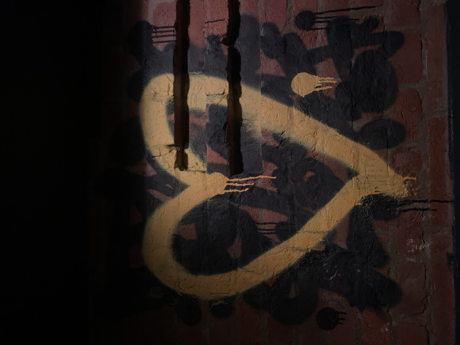 A close-up reveals a brick wall adorned with graffiti. A yellow, loop-shaped symbol dominates the scene, partially obscured by black splatters and streaks. Vertical lines, seemingly from pipes, cut through the symbol. The lighting is uneven, casting deep shadows on the left side of the image.