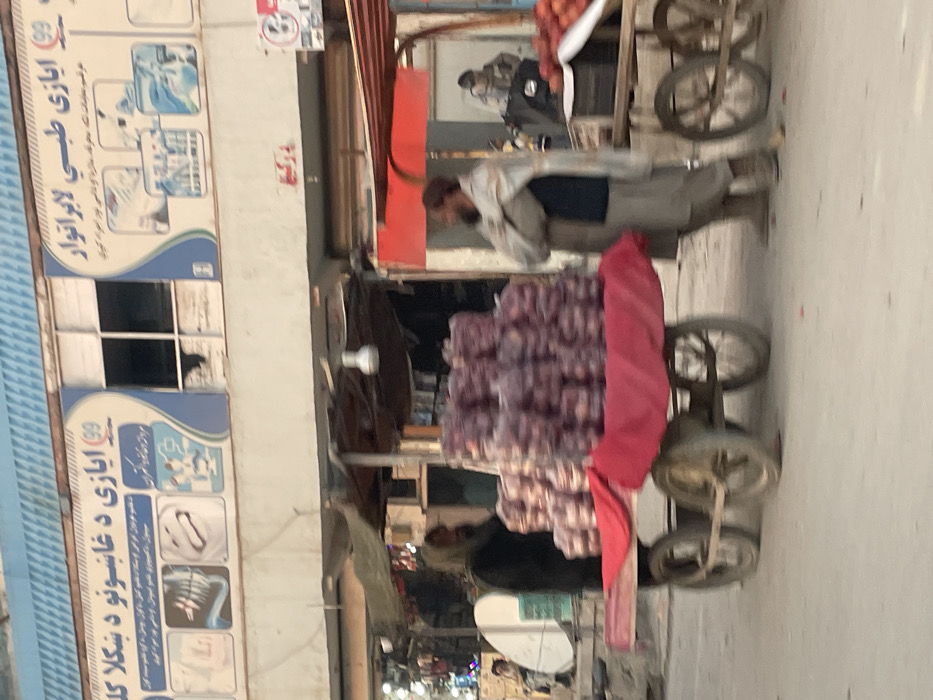 The image displays a street scene within a commercial district of Kandahar, Afghanistan. In the background, a two-story building features a prominent light blue and white sign on its upper facade. This sign displays text in Dari/Pashto identifying it as "Ayazhi Medical Laboratory" and "Ayazhi Dental Clinic," accompanied by graphics depicting dental X-rays, teeth, and medical equipment. One window on this upper floor exhibits a broken pane. The ground level of the building appears to house multiple retail establishments with dark entrances. In the midground, two four-wheeled wooden handcarts, characteristic of street vendors, are present. The cart on the left has a red base and a red fabric covering, upon which numerous clear plastic bags filled with purple-skinned produce, likely onions, are stacked in multiple piles. A male individual, dressed in dark attire and a hood, stands behind this cart. To the right, another handcart, partially visible, features a red awning and holds reddish-orange produce, likely apples, in a dark crate. A male individual, wearing light-colored traditional clothing and a shawl, stands beside this right-side cart with his arms crossed over his chest, facing right. Multiple indistinct figures are present in the blurred background, seated and standing. The street surface is paved, and the scene is illuminated by daylight.