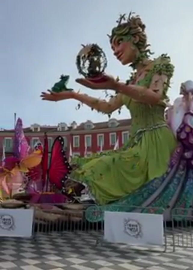 parade scene in a plaza. Giant, colorful parade floats with figures resembling people and nature elements are prominently displayed. A large green statue resembling a seated goddess holds a frog and a glass ball. Another float features a queen-like figure with a rose. People are walking along the black and white checkered plaza, and buildings are visible in the background under a clear sky.
