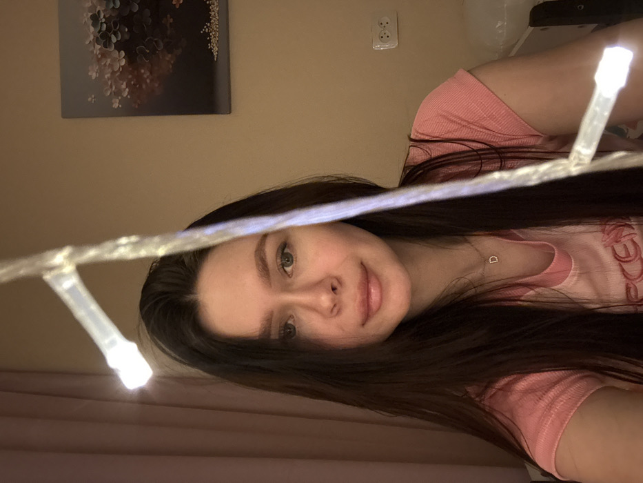 A frontal, mid-shot photograph depicts a female subject in an indoor residential setting in Chaikovsky, Russia. The subject, positioned centrally, has long, dark brown hair, light-colored eyes, and a neutral facial expression, looking directly towards the viewer. She is wearing a light pink short-sleeved top and a necklace with a small "D" pendant. A string of illuminated white LED lights is vertically oriented in the mid-right foreground, partially obscuring the subject's right side and the background elements. The background features a plain light beige wall. To the left, a pink curtain is partially visible. On the right, a rectangular artwork depicting abstract floral shapes in muted tones is mounted on the wall. Below the artwork, a white double electrical outlet is visible. A light-colored piece of furniture is partially present in the bottom right corner of the frame. The lighting environment is dim, with the LED string providing localized illumination.