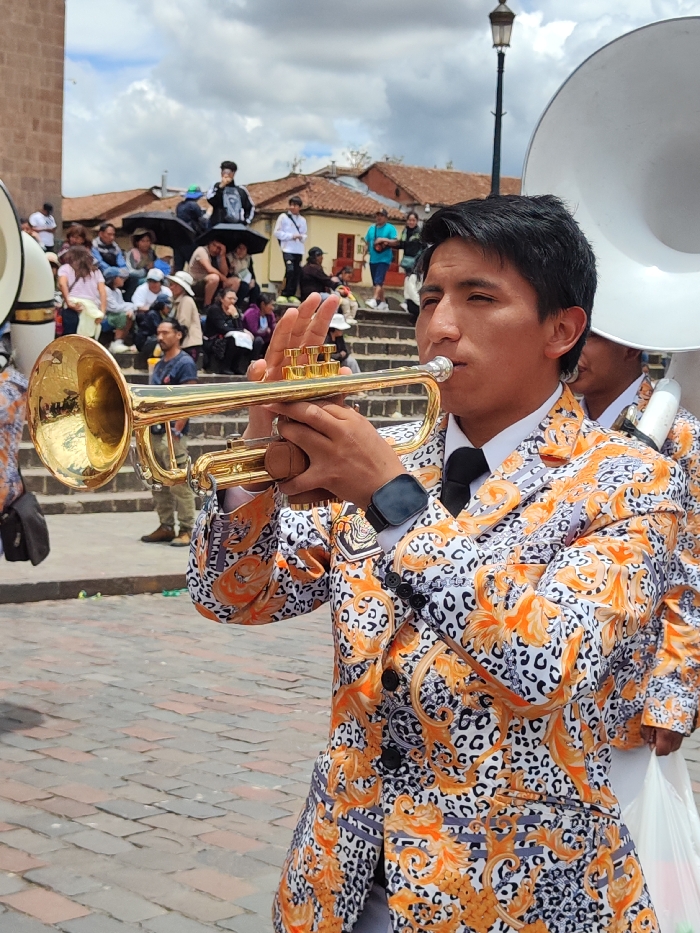 A man in a patterned orange and white suit plays a trumpet. He wears a black tie and a watch on his left wrist. Behind him, a crowd sits on stone steps in front of buildings with red tile roofs, under a cloudy sky. Another band member stands to his right, holding a large tuba. The ground is paved with reddish-brown bricks.