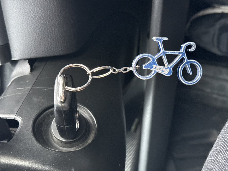 A car key is inserted into the ignition. Attached to the key ring is a small, blue bicycle keychain. The keychain is a flat, cutout shape of a racing bicycle with a white outline. The surrounding area is the dark interior of a vehicle, with textures indicating padded surfaces and hard plastic. A portion of a leg is visible in the upper right.