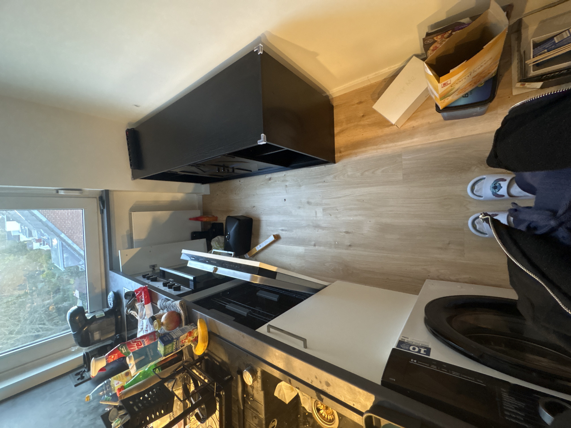 The scene depicts an interior residential kitchen and utility area in Mönchengladbach, Germany