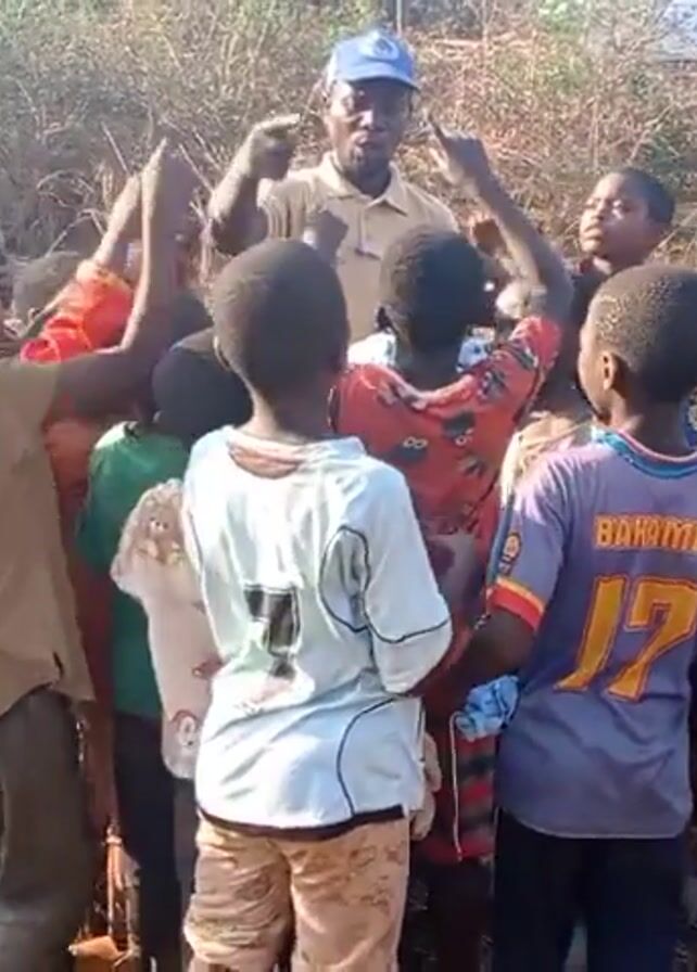 A group of approximately 15 children are huddled around an adult male in a field. The man is wearing a tan shirt and a blue baseball cap. He is gesturing with his hands. The children are wearing various casual clothes. Some are reaching up to touch the man's hands. A few children stand slightly apart from the main group. The background consists of grass, shrubs, and a few houses in the distance. The sky is bright, suggesting it is daytime.