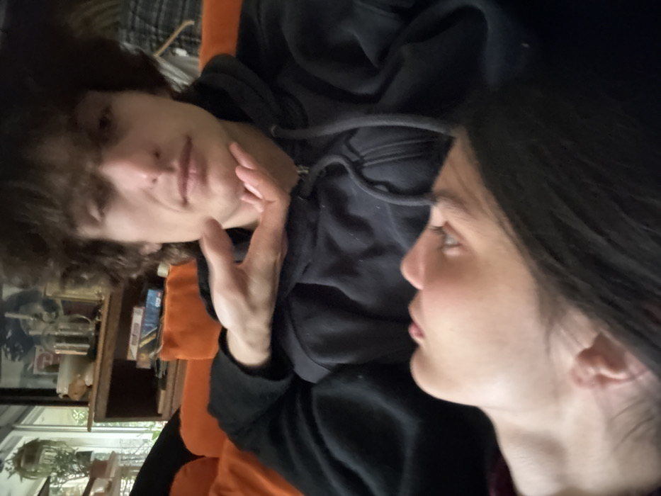 Two individuals, possibly a couple, are captured in a close-up shot. One, with curly brown hair and fair skin, appears relaxed, reclined on an orange surface, dressed in a black hoodie, and gazing towards the other. The second person, likely female, is viewed in profile, showing long, dark hair. The background features a cluttered shelf with various objects and a glimpse of an outdoor space. The lighting is natural and the mood seems intimate.