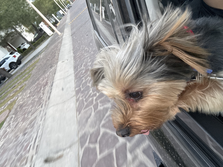 - "A Yorkshire Terrier dog, with windswept brown and grey fur, leans out of a dark-colored vehicle's front passenger window" by FM-ZjnhV2, licensed under CC BY 4.0