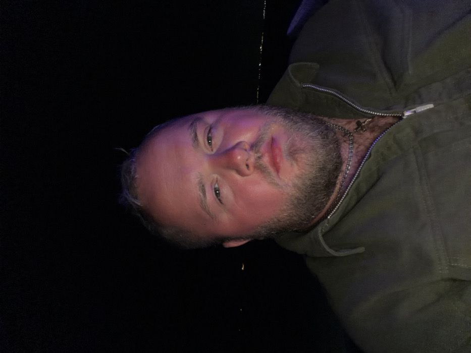 A man with a fair complexion and a light-colored beard is wearing a dark green jacket and a silver chain with a cross. The photo is taken from a low angle against a dark background. The man's face is partially illuminated, with a slight reddish tint on his cheeks. His eyes are open and looking towards the camera. The collar of the jacket is zipped up, and the chain is visible above it.