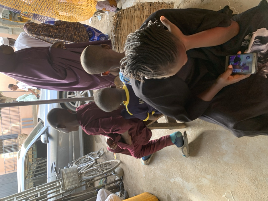 This image depicts an outdoor scene in Gawuna, Nigeria, showing multiple individuals within what appears to be a market or busy street setting