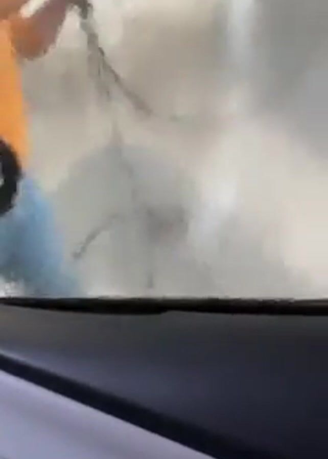 person inside a car, likely going through a carwash. Through the windshield, one can see water streaming down, obscuring the outside view. A man wearing an orange shirt and blue jeans is seen with a hose, spraying what appears to be soap or some type of cleaning agent onto the car. He is holding the hose attachment with both hands and moving it across the windshield. The interior of the car is visible, including the black door panel and the gray dashboard.