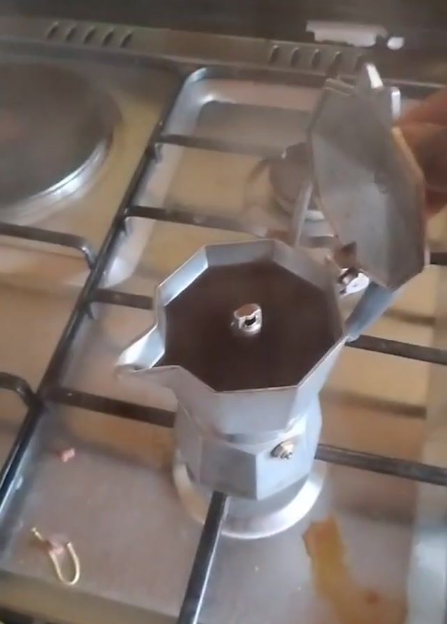 Moka pot on a gas stovetop. The Moka pot is silver and partially full of coffee, with the lid open. Steam rises from the coffee. The stovetop is stainless steel with black grates. To the left of the Moka pot is an electric burner. There is a small gold-colored object on the stovetop near the bottom left corner. There is also a brown stain on the stovetop to the right of the Moka pot. The background includes yellow and beige tiling. The camera zooms in slightly on the coffee in the Moka pot.