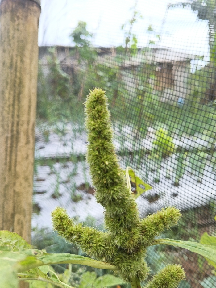 A fuzzy, elongated green plant part stands prominently in the foreground. It features short, spiky protrusions along its length. Behind it, a blurred background reveals a garden setting with rows of crops covered in white plastic, partially obscured by a black net. A weathered, cylindrical pole is visible to the left. The overall scene suggests a cultivated garden environment.