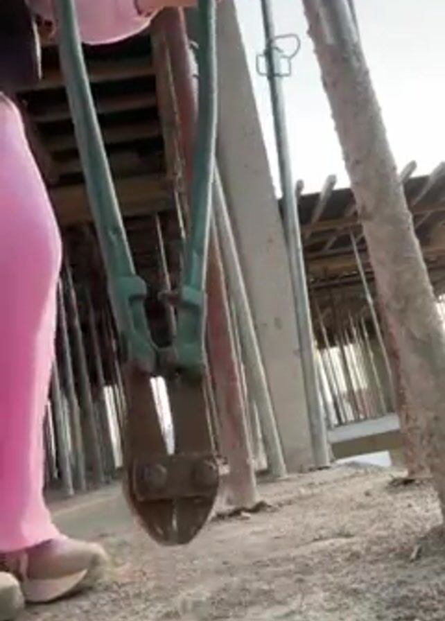 A woman with long red hair, wearing pink pants, a vest, and sneakers, is holding large bolt cutters on a dirt surface. She raises the bolt cutters and attempts to cut something on the ground. The background shows concrete support structures and a partially constructed building.