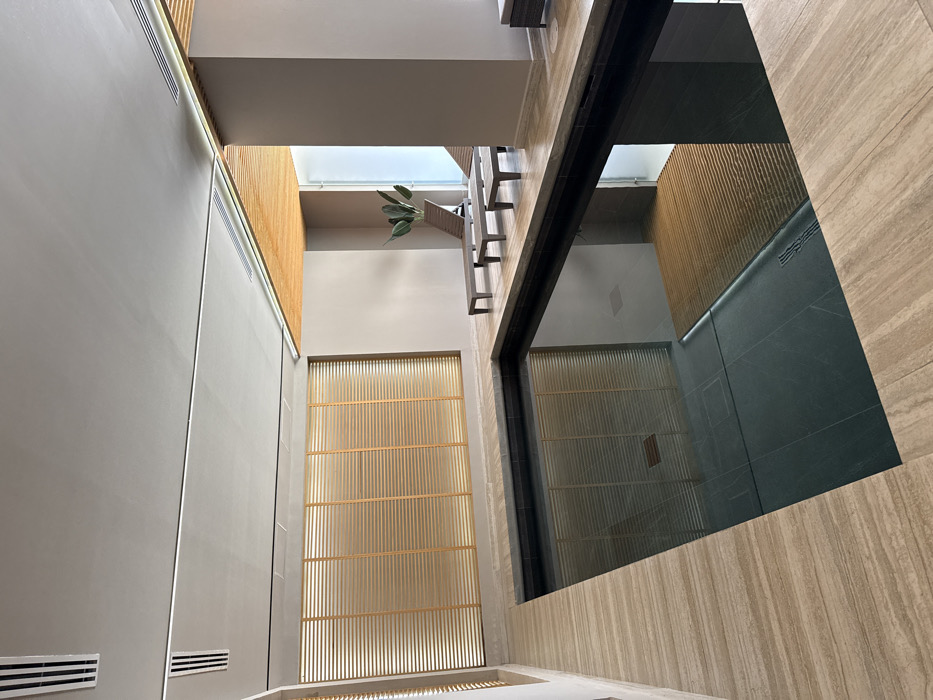 The image depicts a modern, minimalist indoor swimming pool area located within Mexico City, Mexico. The precise address or specific venue within the city is not discernible from the visual information. The rectangular pool features dark, still water that reflects the ceiling and surrounding architecture. A submerged light-toned wooden slatted platform or ramp is visible at one end of the pool. The pool deck is constructed from light-colored, horizontally striped tiles, resembling travertine. A large wall on the left is entirely covered with light-toned horizontal wooden slats. On the right side of the deck, two contemporary lounge chairs with dark frames and light-colored cushions are positioned. Behind the lounge chairs, a tall potted plant with broad green leaves stands near a light-colored wall. The ceiling is light grey, equipped with multiple long, linear recessed light fixtures and several rectangular ventilation grilles. A section of the ceiling above the lounge chairs is also clad with light-toned horizontal wooden slats. No individuals are present in the scene, and no actions or interactions are depicted.