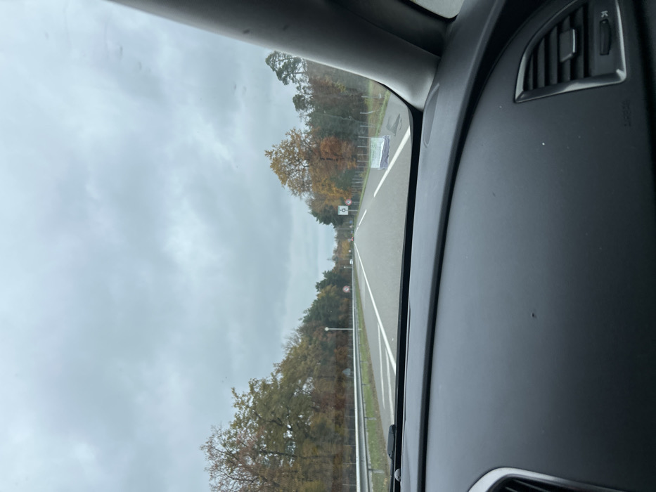 The image presents a forward view from inside a vehicle traveling on a divided two-lane road in Haguenau, France. The sky is uniformly overcast, indicating daytime conditions. The road surface is asphalt, marked with solid white lines defining the shoulder and dashed white lines separating the two lanes. A silver metal guardrail runs parallel to the left side of the road. Both sides of the road are lined with dense tree coverage, displaying autumnal foliage with various shades of green, yellow, and orange/brown, interspersed with darker evergreen trees. Several road signs are visible. On the left side, a white circular sign with a red border indicates an 80 km/h speed limit. On the right side, further down the road, a white circular sign with a red border and a diagonal line through the number '80' signifies the end of the 80 km/h speed limit. Adjacent to it, a blue circular sign with white swirling arrows indicates a mandatory direction or roundabout ahead. In the foreground, the dark gray dashboard of the vehicle occupies the lower portion of the image, showing part of an air vent on the right. Through the lower right section of the windshield, a small, partially obscured white and blue sign is visible on the grassy verge beside the road. No individuals are visible.