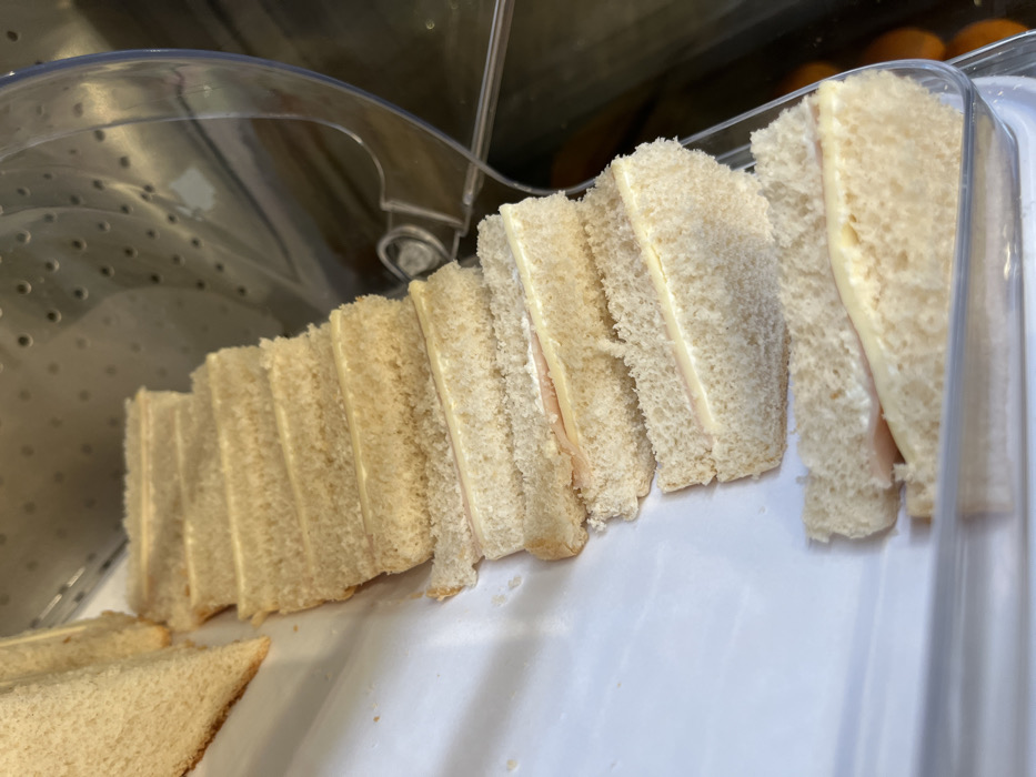 - "close-up of a row of nine ham and cheese sandwiches arranged on a white paper-lined tray inside a clear plastic container" by FM-lnhCZ2, licensed under CC BY 4.0