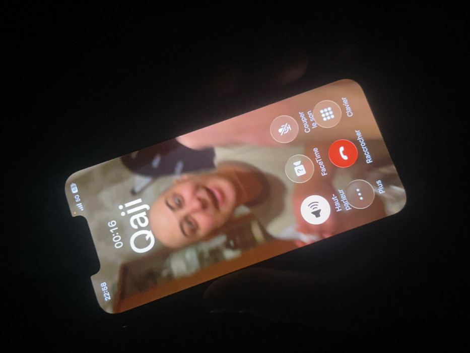 A phone screen displays an ongoing FaceTime call with a person named "Qaji