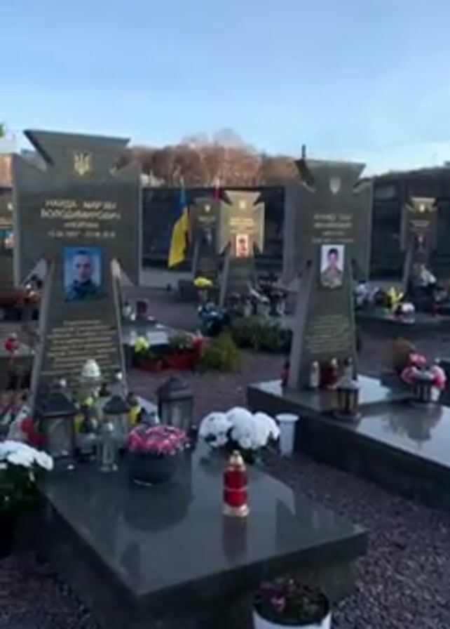 cemetery with rows of graves. The graves are marked with dark granite crosses that bear photographs of individuals and inscriptions. Ukrainian flags are placed on some of the graves. The ground is covered with pebbles, and a brick walkway runs through the cemetery. There are flowers, candles, and other decorations on and around the graves. The sky is blue.