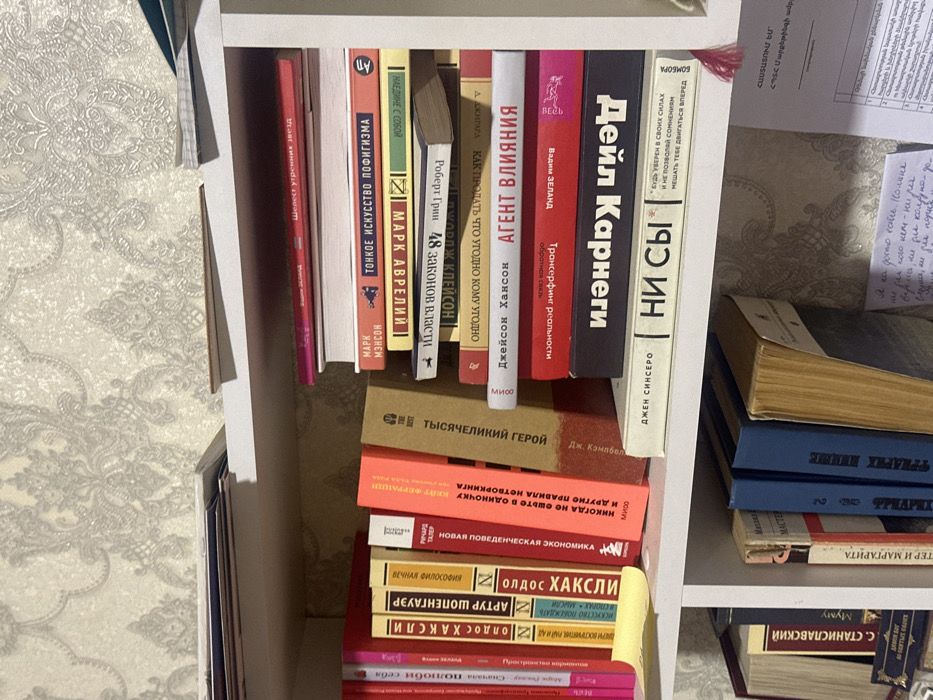This image depicts a section of a white wooden bookshelf inside a room in the city of Tairov, Armenia. The background features patterned wallpaper with a light beige or cream base and a slightly darker, ornate damask-like design. The top of the visible shelf unit holds a stack of papers or magazines on the left. The upper shelf contains numerous books. On the left side, a row of books stands vertically, predominantly with red, yellow, orange, and light brown spines. Notable visible titles, primarily in Cyrillic script, include "Олдос Хаксли," "Артур Шопенгауэр," "Никогда не ешьте в одиночку," and "Тысячелетний герой." A yellow sticky note is partially affixed to one of the red book spines on the far left. On the right side of this shelf, a vertical stack of horizontally placed books is visible. From top to bottom, prominent titles include "Шелест утренних звезд," "Марк Мэнсон / Тонкое искусство пофигизма," "Марк Аврелий," "Роберт Грин / 48 Законов Власти," "Джейсон Хэнсон / Агент влияния," a red book with "Трансерфинг реальности," "Дейл Карнеги," and "Джен Синсеро / Ни сы." The lower shelf, partially visible at the bottom of the image, also holds books standing vertically, including "К. Станиславский" and "Мастер и Маргарита," alongside several blue-bound volumes. To the right of the lower shelf's books, loose papers are present; one appears to be a document with Armenian script at the top, and another contains handwritten text in Cyrillic. A red tassel hangs down from the upper shelf, resting near these papers. No individuals are present in the scene, and no specific actions or interactions are depicted beyond the arrangement of objects.