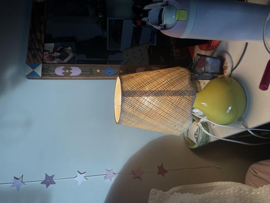 A yellow lamp with a patterned lampshade sits on a white surface near a mirror with a photo attached. A pink and white water bottle and other desk items are also present. A string of pastel star decorations hangs near a white, lacy fabric, adding a whimsical touch. The light from the lamp casts a soft shadow on the light blue wall.