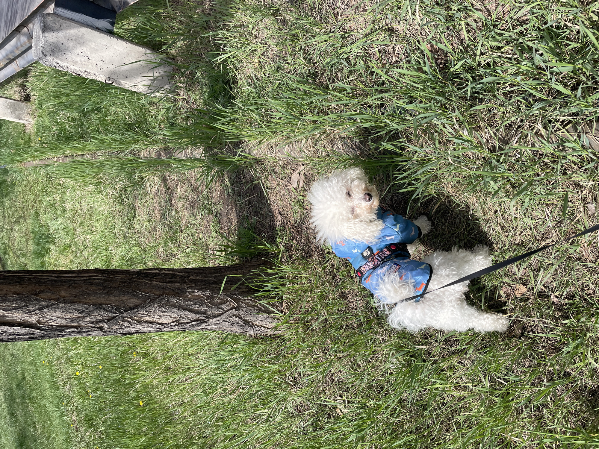 - "A small, white, curly-haired dog wearing a blue harness and leash lies in green grass next to a tree trunk" by FM-i2V4x1, licensed under CC BY 4.0