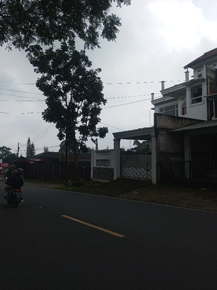 The image depicts a roadside view in the city of Sandamal Eliya, Sri Lanka, under an overcast sky. A dark-colored paved road with a single broken yellow line runs across the lower foreground. A person wearing dark attire and a helmet is operating a dark motorcycle, traveling away from the viewer on the left side of the road. Utility lines span horizontally across the upper midground. A tall, dark-leafed tree stands prominently in the mid-left. To the left of the tree, behind a dark fence, a structure with a dark roof and a partially visible sign indicating "TAHU" is present, alongside several conical evergreen trees. To the right, a multi-story white building with a red-tiled roof and visible windows occupies the mid-to-background. The building features an ornate white entrance gate with decorative pillars and metalwork, leading from the road. The ground immediately in front of this gate entrance is unpaved earth. Portions of the building appear to be unfinished or undergoing construction, revealing exposed concrete and blockwork.