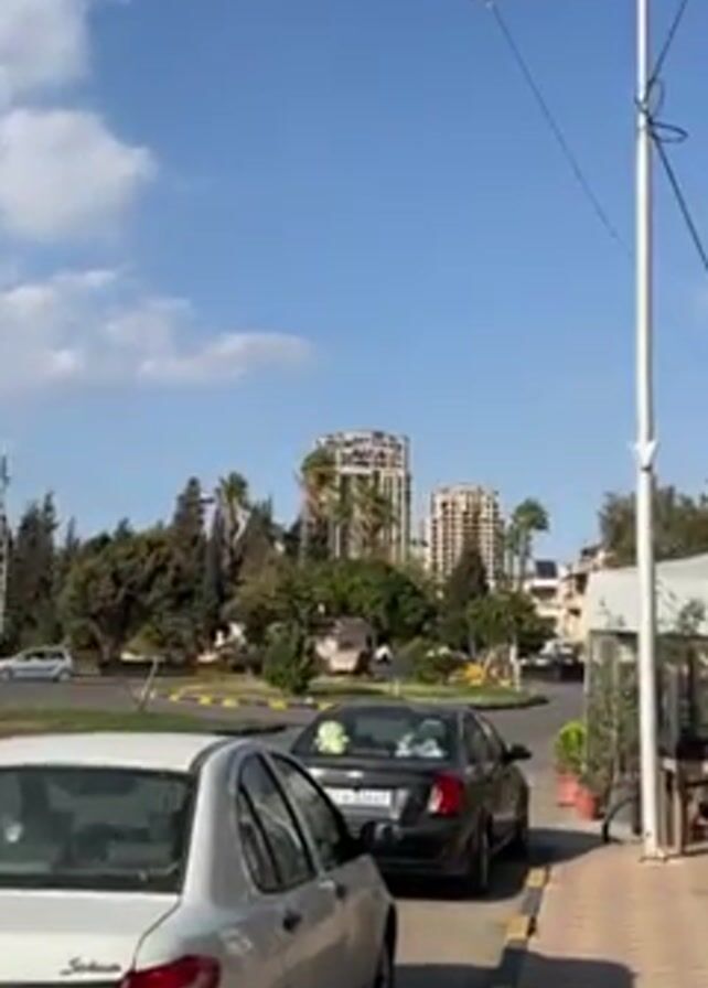 two tall buildings under construction, viewed from a street with parked cars and a roundabout. The buildings are made of concrete and appear to be multi-story structures. Tall palm trees and other greenery surround the base of the buildings. The street is paved with a yellow brick pattern, and several cars are parked on the side of the road. A light pole stands near the edge of the street, and the sky is a clear blue with some clouds.