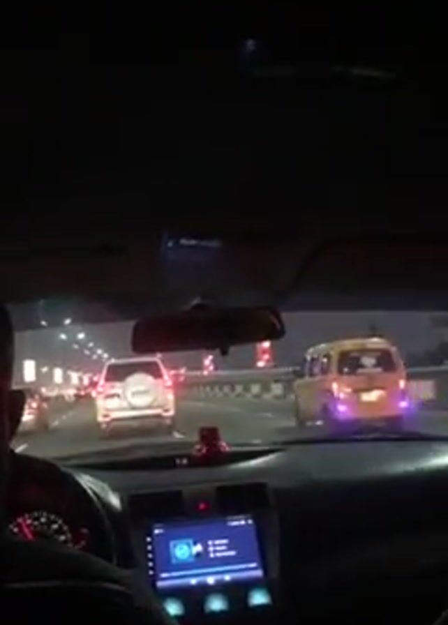 The video, shot from the driver's seat of a car at night, shows a view through the windshield of a highway with multiple lanes. Other vehicles, including a white SUV and a yellow taxi, are visible on the road ahead, their taillights illuminated. The highway is lit by streetlights. The car's dashboard is visible, featuring a steering wheel, speedometer, and a touchscreen display showing a media player interface. The head of the driver is partly visible on the left. The overall environment suggests nighttime urban driving in a moderately busy area.