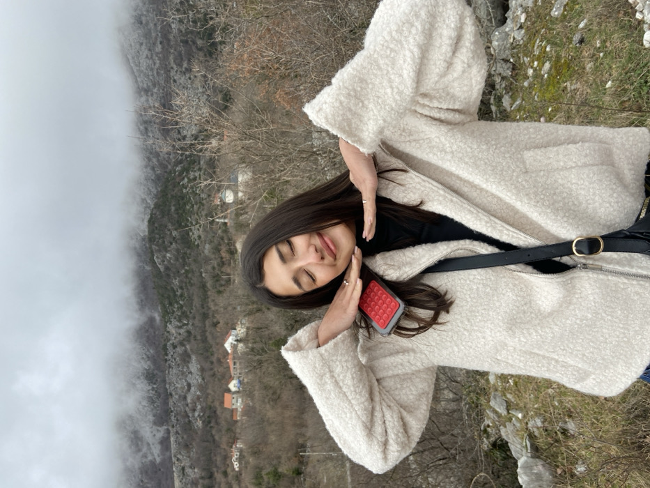 A young female stands outdoors, centered in the frame, in the village of Brajici, Montenegro. She has long dark hair, her eyes are closed, and a subtle smile is present. Her hands are raised to the sides of her face, with a red, grid-patterned tactile device attached to the back of her right hand. She is dressed in a cream-colored, textured zippered jacket over a black turtleneck, with a black cross-body bag across her body. The background features a cluster of residential buildings with red-tiled roofs in a valley, backed by a rugged mountain range. The mountains are partially obscured by dense fog or low clouds, and the surrounding vegetation consists of sparse, bare trees and dry brush, with rocky terrain in the foreground and middle ground under an overcast sky.