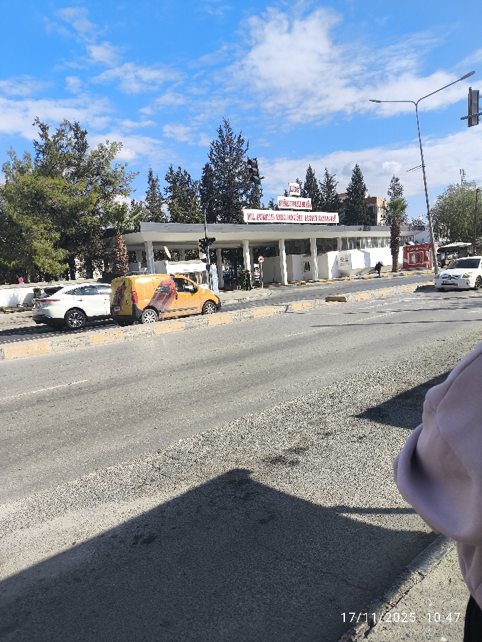The image, dated 17/11/2025 at 10:47, depicts an outdoor urban scene under a blue sky with scattered white clouds. The primary subject is a single-story white building with a flat roof and multiple open bays, identified by a large red sign on its facade that reads "DR. BURHAN NALBANTOGLU DEVLET HASTANESI." A smaller white sign with red text "MÜZE" is visible above it. This building is located on the north side of a multi-lane asphalt road, consistent with the area surrounding the Dr. Burhan Nalbantoğlu State Hospital in Northern Nicosia, Cyprus, near a former border crossing point such as the Ledra Palace checkpoint. On the left side of the road, two vehicles are parked: a white SUV and a yellow delivery van displaying a large graphic of a beverage bottle. On the right side of the road, a white sedan is visible. At least two individuals are present: one partially obscured near the yellow van, and another standing on the pavement in front of the white building near a palm tree. Numerous evergreen trees are visible around and behind the main building. Streetlights and traffic signals are present on poles. A red booth-like structure is visible on the far right pavement. The foreground includes a portion of a light-colored sleeve and the shadow cast by the photographer.