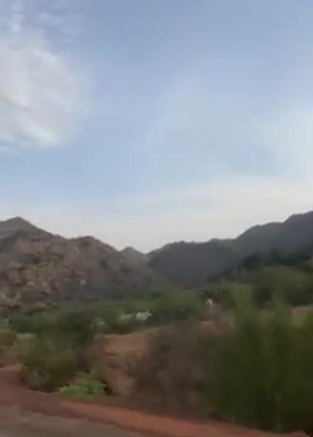 view from a moving vehicle, likely a car, traveling on a road next to a mountainous landscape. The mountains are rocky with sparse vegetation. The sky is light blue with scattered clouds. The terrain near the road is reddish soil with some low-lying green bushes.