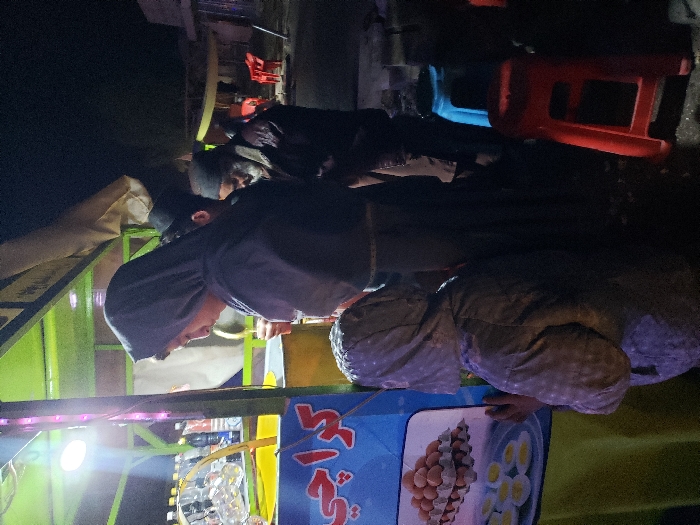 A street food vendor wearing a hooded garment attends to their cart, which displays images of boiled eggs. People clad in dark clothing gather around the brightly lit stall. Stools in the background hint at a place to sit and enjoy the food. The scene appears to be set at night.
