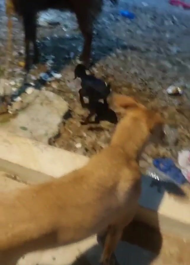 brown dog looking toward a dark brown goat standing on a roadside with a small black goat. The goat is standing on a patch of ground covered with leaves, dirt, and litter. A small section of the road can be seen in the background. The dog is on a tiled area.