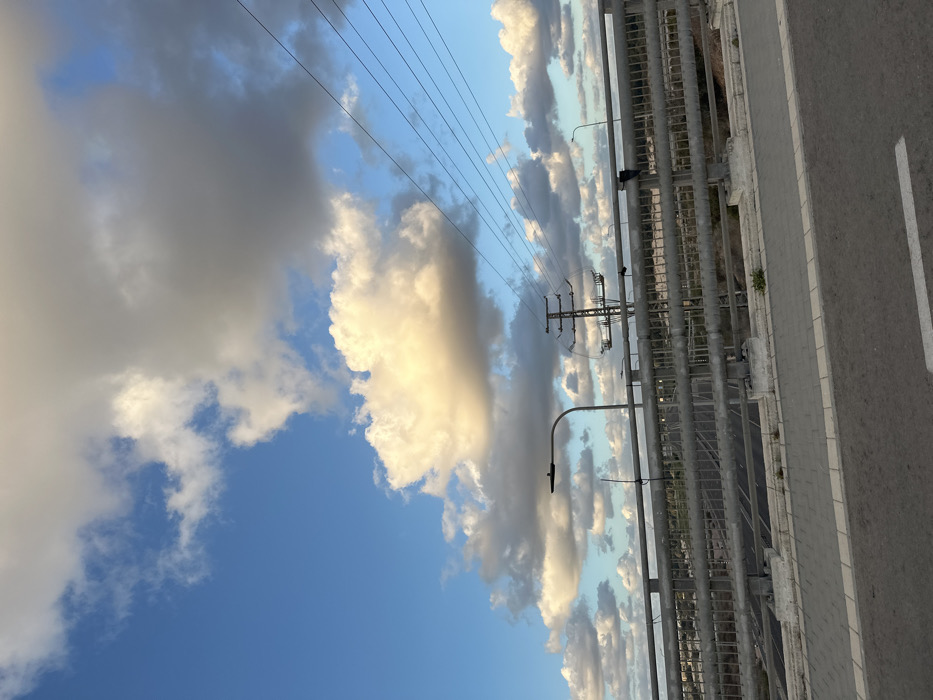 The image depicts a static scene from an overpass or bridge in Hofit, Israel, under a partially cloudy sky. The sky features distinct patches of bright blue and numerous cumulus clouds, varying in brightness with areas illuminated by sunlight and others in shadow. In the immediate foreground, a grey metal guardrail system, composed of horizontal bars and vertical posts, is mounted on a concrete barrier. To the right of the guardrail, a paved pedestrian walkway is visible, constructed from grey and white interlocking pavers. Adjacent to the walkway on the left, an asphalt road surface is present. From the left side of the bridge, a tall street light with a curved arm and a dark, horizontal fixture extends upwards. In the mid-ground, a large metal electricity pylon, characterized by its lattice structure, is situated on the right side, supporting multiple overhead power lines that traverse diagonally across the upper right portion of the sky. A dark, unidentified object is suspended from the guardrail on the right side of the bridge. Below the bridge, a multi-lane roadway is visible, featuring white lane markings and bordered by sparse vegetation. No individuals, vehicles, or dynamic actions are present in the scene.