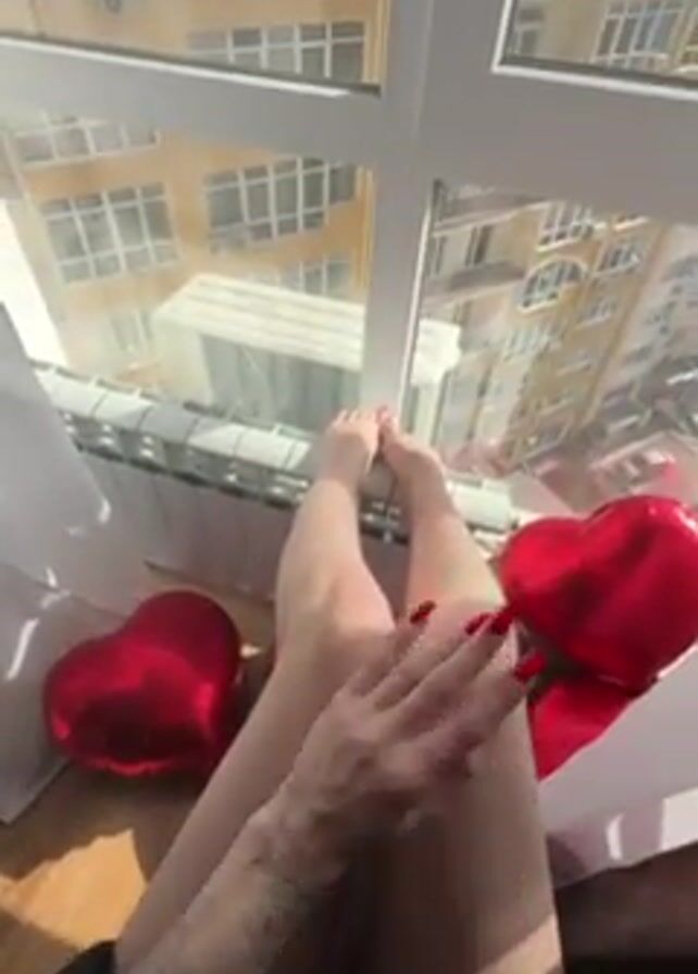 person sitting in front of a window, with their legs raised and feet visible. They are wearing long red nail polish and making a peace sign with their hand. The legs appear pale in complexion. Two red, heart-shaped balloons are visible on either side of the legs. The background shows a light-colored building across the street. The person is wearing a black robe. The window frame is white. A heater is visible beneath the legs.