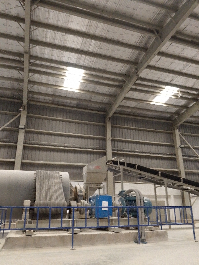 large industrial facility in Pangasia, Bangladesh (latitude: 22.694, longitude: 90.601). The scene is a large, open industrial space with a metal roof and corrugated metal walls. In the foreground, there is a large, industrial-sized machine, with a large, cylindrical drum, a conveyor belt, and an electric motor. The machine is secured behind a blue, metal safety railing. The metal roof is supported by large, metal beams. The floor is concrete and dusty. There are no people in the image. The image was taken indoors in a brightly lit, industrial setting.