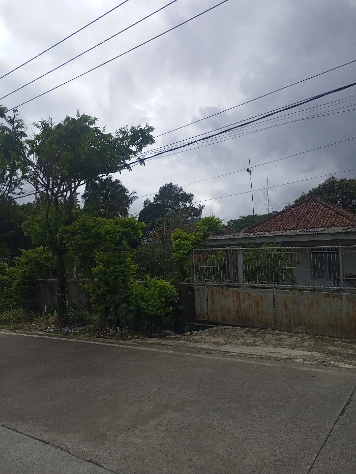 A cloudy sky hangs over a street, with a small house behind a metal fence and lush green foliage. A tree stands tall on the left side, obscuring part of a concrete wall. Utility lines crisscross the sky. The house has a red-tiled roof and a glimpse of a window can be seen. The scene conveys a sense of overcast weather in a suburban or rural area.