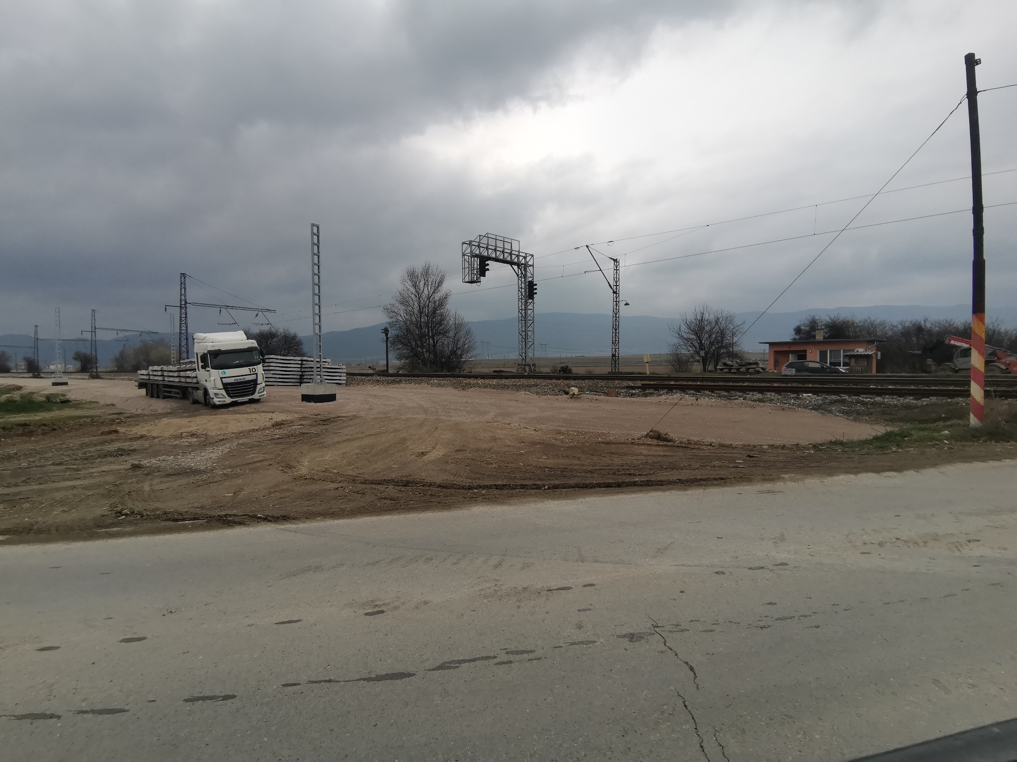 An overhead view reveals a railway construction or maintenance area in Zhivkovo, Bulgaria, under a heavily overcast, dark grey sky. The foreground consists of a cracked grey asphalt road, transitioning into a large expanse of uneven, light brown dirt and gravel terrain marked with tire tracks. In the midground, a white DAF semi-truck with a flatbed trailer is parked facing right on the dirt area. The trailer is loaded with horizontally stacked precast concrete railway sleepers. Adjacent to the truck, several organized stacks of identical concrete sleepers are visible. Multiple parallel railway tracks traverse the scene horizontally, equipped with an overhead electrification system comprising numerous metal gantries, poles, and tensioned wires. A prominent metal gantry structure with signal apparatus is centrally located above the tracks. Scattered bare trees and sparse scrub vegetation are present across the midground. To the far right, beyond the railway tracks, a small, single-story building with an light orange facade and a dark roof is situated. A dark-colored vehicle is parked directly in front of this building. Partially obscured behind the building, red and grey construction equipment, specifically identifiable as a "MANITOU" telehandler or similar, is present. A tall, dark utility pole with distinctive red and white diagonal stripes near its base stands on the far right edge of the frame. The background features a long line of distant, low-lying hills or mountains extending across the horizon. No individuals are visible within the scene.