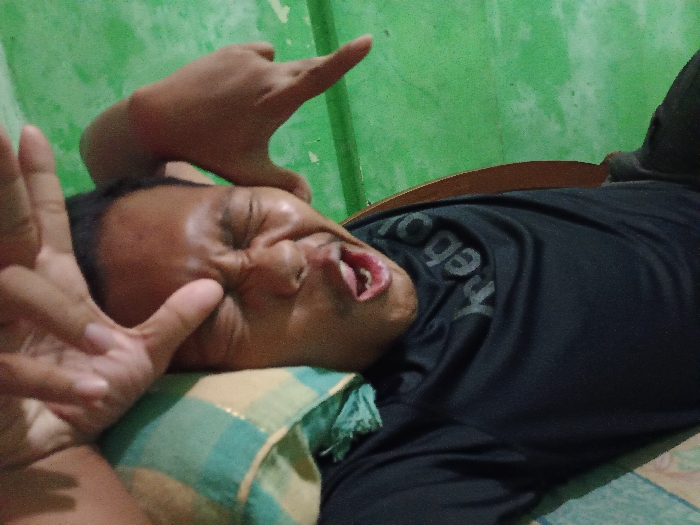 The image captures an adult male observed indoors, lying supine or partially on his side, against a distressed green wall, in Kecamatan Pati, Indonesia