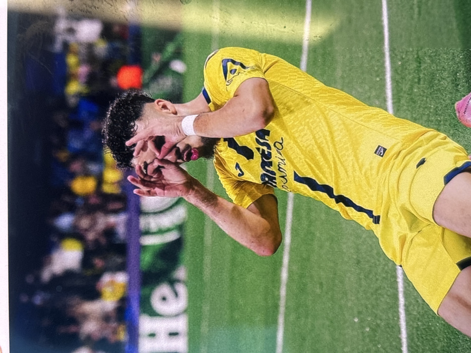 A male soccer player is depicted on a green artificial turf field in a stadium, likely in Hoenheim, France. He is wearing a yellow short-sleeved jersey with the "JORGESA CERAMICA" logo and yellow shorts. Both hands are raised to his face, with his index fingers and thumbs forming circles around his eyes in a goggle-like gesture. His mouth is slightly open with puckered lips. A white wristband is visible on his right wrist. A pink object, consistent with a soccer boot, is partially visible at the bottom right. The background features blurred stadium seating filled with spectators and a digital advertising board displaying a partial "Heineken" logo, indicating an evening or low-light event under artificial illumination.