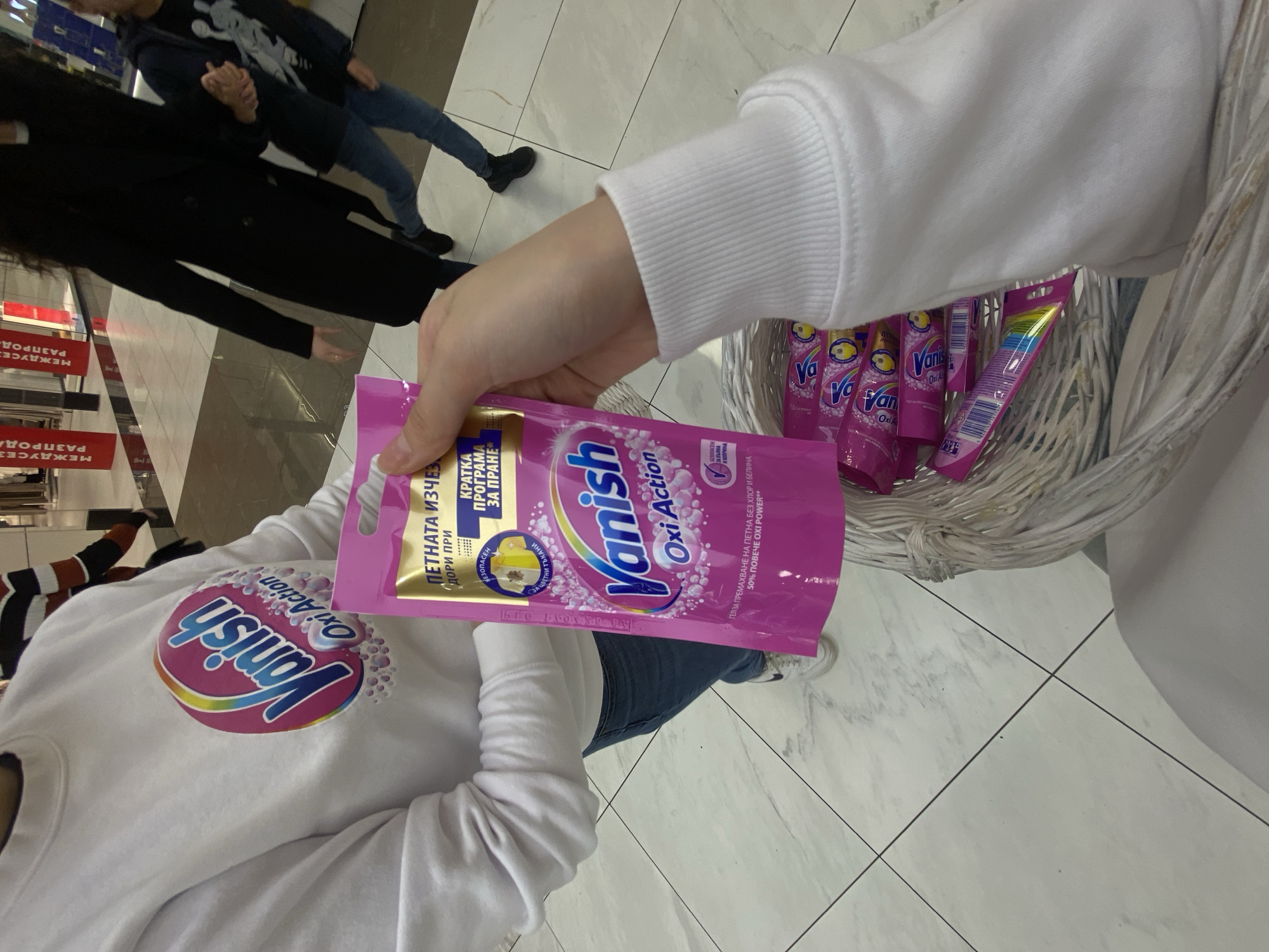The image depicts an indoor scene within a shopping mall in Sofia, Bulgaria. The perspective is first-person, focusing on an interaction between two individuals involving a retail product. In the immediate foreground, a person's right hand, wearing a white long-sleeved top, holds up a single pink flexible pouch of "Vanish Oxi Action" stain remover. The pouch features Bulgarian text, including "ПЕТНАТА ИЗЧЕЗВА" (Stain disappears) and "КРАТКА ПРОГРАМА ЗА ПРАНЕ" (Short wash program), along with "ГЕЛ ЗА ПРЕМАХВАНЕ НА ПЕТНА БЕЗ ХЛОР И БЕЛИНА" (Stain removal gel without chlorine and bleach) and "50% ПОВЕЧЕ OXI POWER". Below the held pouch, a white woven basket is partially visible, containing multiple identical pink "Vanish Oxi Action" pouches. Directly opposite, another individual, partially visible from the chest down, wears a white sweatshirt with a large circular "Vanish Oxi Action" logo printed on the front, blue jeans, and white sneakers. Their left arm is extended towards the foreground, appearing to be in the process of presenting or receiving the product. The background reveals a brightly lit shopping mall environment with a clean, light-colored tiled floor arranged in a grid pattern. Several other individuals are present: a person in a black long coat walks towards the left, holding hands with a child in a dark hooded jacket and blue jeans. Red rectangular signs with white Bulgarian Cyrillic text, reading "МЕЖДУСЕЗОННА РАЗПРОДАЖБА" (Mid-Season Sale), are visible on vertical structures in the mid-background, confirming a retail sale context.