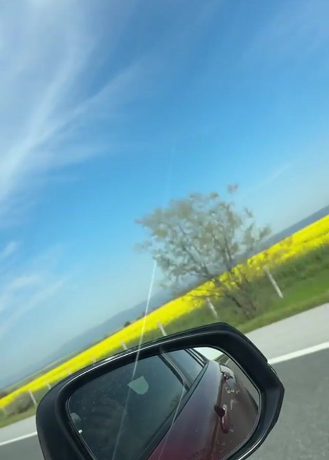 view from inside a moving car, focused on the side mirror. The mirror reflects the red body of the car and a glimpse of a person inside. Outside the car, a bright blue sky with wispy clouds is visible. In the background, a field of vibrant yellow flowers stretches along the roadside, with hills or mountains faintly visible in the distance. The car is traveling on a paved road.