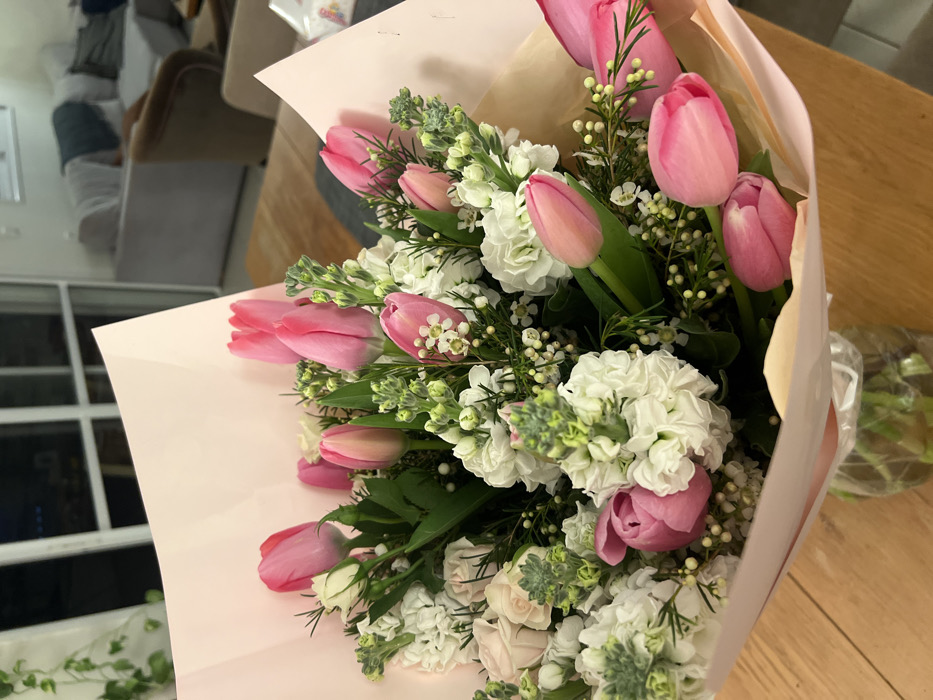 - "A vibrant bouquet features pink tulips, interspersed with white stock flowers and delicate sprigs of tiny white blooms" by FM-3hXJP2, licensed under CC BY 4.0