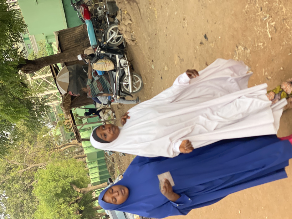 Two women wearing hijab stand on the side of a street next to a parked motorcycle. One woman wears a white hijab and the other a blue one. The woman in blue holds a small white card. In the background are green trees, a building, and a man sitting under an umbrella. The ground is a mix of dirt and paved surfaces.