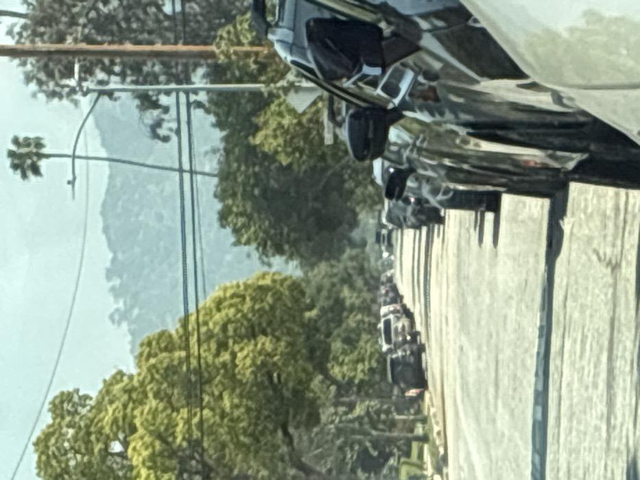The image displays a static daytime street scene in Glendale, United States of America. The perspective is from a vehicle, with the hood of a white vehicle partially visible in the extreme lower right foreground. A column of dark-colored vehicles, primarily SUVs and sedans, is parked diagonally along the right side of an asphalt roadway, extending into the background. A parallel row of vehicles is parked along the left side of the street, bordered by a tree-lined sidewalk featuring mature green trees. Utility poles, including both wooden and metal streetlight poles, support multiple overhead power and communication lines along the right. A tall, slender palm tree is visible above the utility infrastructure against a pale blue sky. In the hazy distance, multiple layers of verdant, tree-covered hills or mountains are present. No individuals or active interactions are visible.