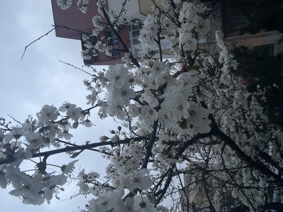 The image captures a dense cluster of white blossoms, likely plum or cherry, on dark, slender branches, dominating the foreground and midground. Numerous individual flowers exhibit five white petals and prominent stamens tipped with tiny orange-red anthers. Some unopened buds are also visible. A thin red string is tied around a branch in the lower right quadrant. In the background, under an overcast pale grey sky, multiple multi-story buildings are visible. To the left, a grey residential structure with visible windows is partially obscured by the bare branches of other trees. To the right, a building with a terracotta-colored upper facade and lighter lower sections features a balcony on which clothes are hanging to dry. The scene depicts an urban environment during early spring in the city of Plovdiv, Bulgaria. No individuals or direct interactions are visible.