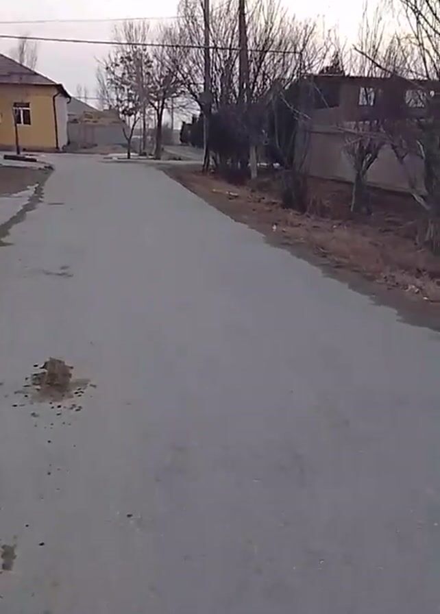 sparsely populated residential street in what appears to be a rural or suburban area. The street is asphalt and has some minor damage. Along the side of the street are houses, some of which are under construction. Leafless trees and bushes border the road. Utility poles with overhead wires run along the side of the street. The sky is overcast, suggesting a dull or late-day lighting. There are no people or vehicles immediately visible in the frame.