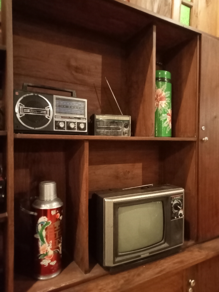 A dark wooden display cabinet, located in Margorejo, Indonesia, holds a collection of vintage items within its partitioned shelving. The top shelf features a black boombox-style radio with a silver speaker grille and control panel on the left, positioned next to a smaller, silver-toned portable radio with an extended antenna. In a separate compartment on the top right, a green insulated bottle is present, adorned with red and white floral patterns. The bottom shelf contains a red insulated bottle decorated with a green dragon and Chinese characters in its left compartment. Adjacent to it, in a right-hand compartment, a compact black and silver vintage cathode-ray tube television set is displayed, featuring a screen and control knobs on its right side. The cabinet exhibits visible wood grain, and a light green panel or window is partially discernible in the upper right background.