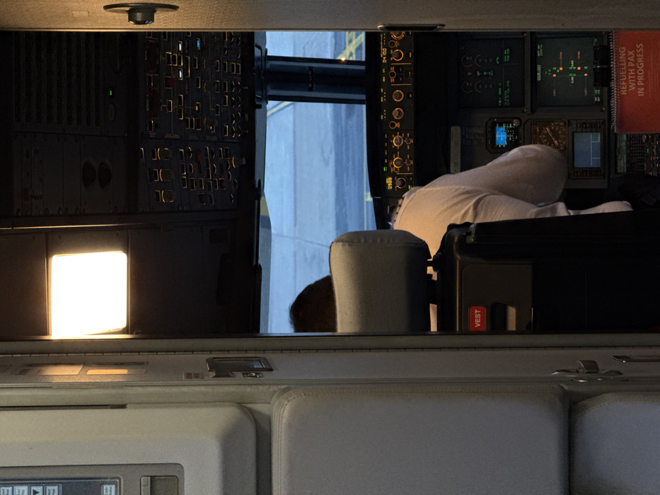 Inside an aircraft cockpit, a seated person in a white shirt is visible. A panel filled with numerous buttons and switches is on the left wall, illuminated by a bright square light. Various instrument panels and screens are on the right. Outside, a grey tarmac can be seen through the cockpit windows. In the foreground, a section of the cockpit interior, with white padded surfaces and control panels, is visible.