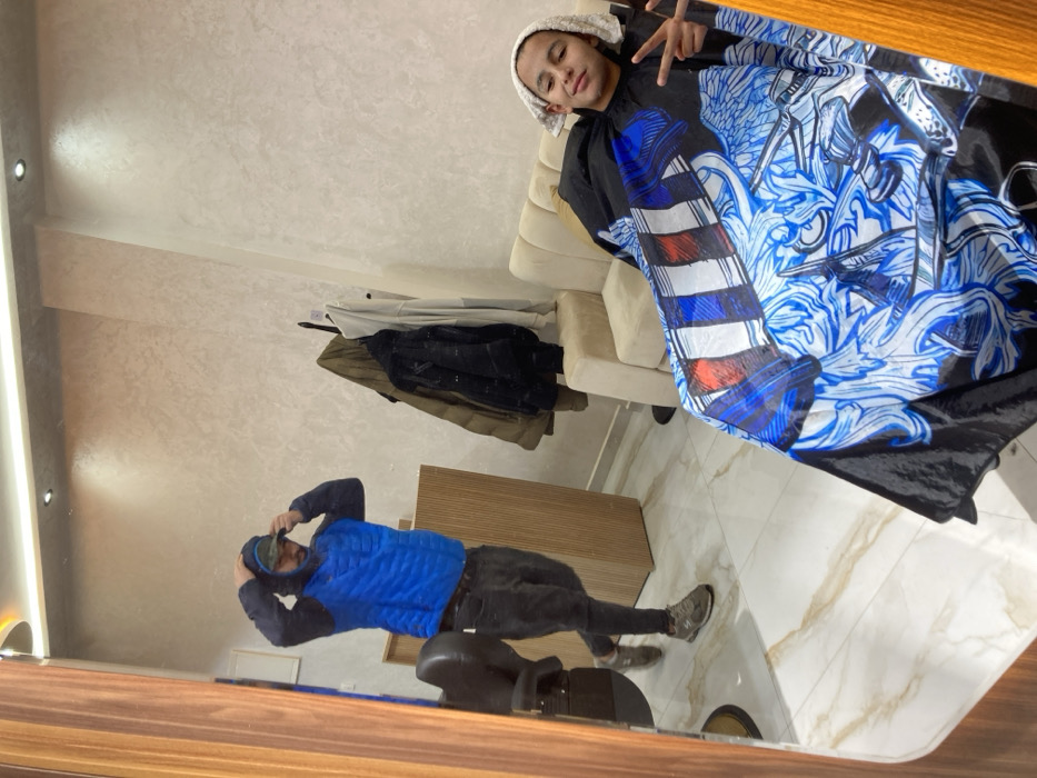 A reflective image shows a young person with a towel on their head, draped in a barber cape with a lighthouse design, flashing a peace sign. Behind them is a light-colored sofa. Reflected is a person in a blue jacket, presumably taking the photo in a barber shop, with a chair visible. There's also a layered coat and some paneling behind them. The floor is light-colored and polished.